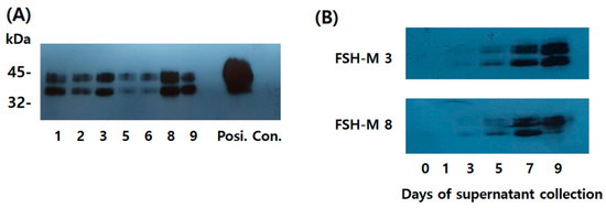 Western blotting analysis of rec-eel FSH-M proteins produced by monoclonal cells. Supernatants were collected from seven colonies on the day of cultivation. The samples were prepared for SDS-PAGE. Membranes were detected using specific monoclonal antibodies (anti-eel FSH5A14). (A) In total, 20 µL collected on day 9 was loaded in the wells. Positive controls produced from the CHO-S cells were concentrated by 20 times and 20 µg was loaded in the wells. Two specific bands were detected for all samples. (B) Colonies judged to secrete large amounts were selected for Western blot analyses. We choose two colonies (eel FSH-M 3 and FSH-M 8) and 20 µL of the supernatant was used for Western blotting on the day of culture. Faint bands were first detected on day 3 and band intensity increased gradually, reaching a maximum on day 9.