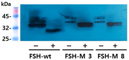 Deglycosylation results for eel FSH-wt and FSH-M proteins. The proteins collected from eel FSH-wt 3, FSH-M 3, and FSH-M 8 were treated with peptide-N-glycanase F to remove N-linked oligosaccharides, followed by Western blotting. The molecular weights of rec-eel FSH-wt and FSH-M decreased significantly to approximately 8–10 kDa.