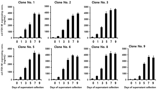 To analyze the quantities of secreted protein in the seven eel FSH-M clones, the supernatants were collected on days 1, 3, 5, 7, and 9 post-culture. The quantity of rec-eel FSH-M protein increased gradually (Figure 6). Rec-FSH-M levels were 578–1790 ng/mL on day 3, similar to the results for eel FSH-wt. The concentrations increased rapidly 2167–3945 ng/mL on day 5, reached 3465–4450 ng/mL on day 7, and remained steady until day 9. The highest concentrations were 4450 ± 250 and 4620 ± 120 ng/mL on days 7 and 9 for clone 3, respectively. The concentrations were high on days 7 and 9 post-cultivation for all clones. Thus, tethered rec-eel FSH-M in CHO DG44 cells was collected on day 9 post-cultivation.