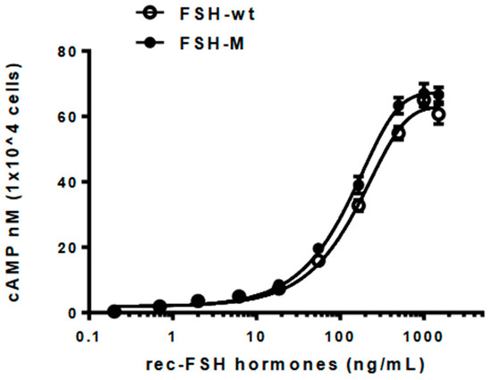 In vitro biological activities were assessed using transfected CHO-K1 cells expressing the FSH receptor, as reported previously [5]. cAMP activation in rec-eel FSH-wt and FSH-M is summarized in Table 1. The dose–response curve for eel FSH-M was slightly left-shifted compared with that of eel FSH-wt (Figure 7). Rec-eel FSH-wt also exhibited full biological activity, with an EC50 value of 159.5 ng/mL and Rmax of 62.8 ± 0.8 nM/104 cells. The biological activity of eel FSH-M was higher than that of FSH-wt, with an EC50 and Rmax values of 129.2 ng/mL and 67.1 ± 0.7 nM/104 cells, respectively (Table 1).