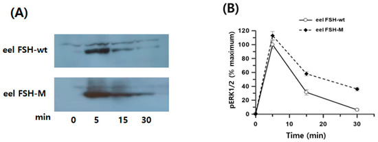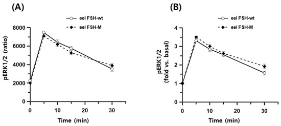 The total ERK1/2 ratio was 11,407–12,115, as determined by time-dependent or dose-dependent assays. Negative controls had total ERK1/2 and pERK1/2 ratios of 329 and 299, respectively. pERK1/2 ratios after the eel FSH-wt and FSH-M treatment were 2247 ± 73 and 1998 ± 43 at 0 min, respectively. At 5 min, pERK1/2 levels increased sharply to 7457 ± 51 and 7091 ± 79 and then decreased to 3511 ± 225 and 3901 ± 238 at 30 min post-agonist treatment (Figure 8A). The pERK1/2 levels did not differ significantly between eel FSH-wt and FSH-M treatments. Basal pERK1/2 levels were slightly lower in the eel FSH-M-treated group than in the FSH-wt group. Subsequently, the ratios observed at 0 min were set to 1, and the results for various time points are presented as fold change values (Figure 8B). The ratios for eel FSH-wt and FSH-M at 5 min were 3.32- and 3.51-fold higher than those at 0 time, respectively, and decreased to 1.56- and 1.92-fold at 30 min, respectively. We also analyzed pERK1/2 activation by Western blotting (Figure 9A,B). After agonist stimulation, pERK1/2 activity was highest at 5 min and decreased to 20% of the maximal level at 30 min. The reductions in pERK1/2 levels were consistent with the homogeneous time-resolved fluorescence (HTRF) results. In the present study, we suggest that the pERK1/2 pathway contributes to signaling through the eel FSH receptor, as in most GPCRs. The pERK1/2 raw date of rec-eel FSH-wt and FSH-M were presented to Supplementary Figure S5.