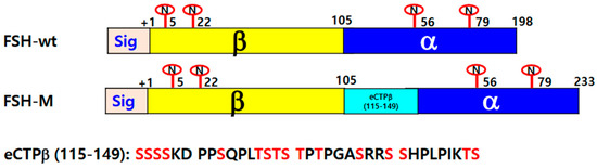 - Fares, F.; Suganuma, N.; Hishimori, K.; Lapolt, P.S.; Hsueh, A.J.W.; Boime, I. Design of a long-acting follitropin agonist by fusing the C-terminal sequence of the chorionic gonadotropin β subunit to the follitropin β subunit. Proc. Natl. Acad. Sci. USA 1992, 89, 4304–4308. [Google Scholar] [CrossRef]