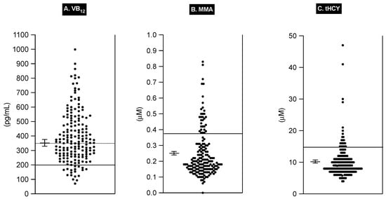 In numerous studies, various combinations of serum VB12/MMA and plasma tHYC values have been proposed to better identify patients with VB12 deficiencies compared to serum VB12/MMA or plasma tHYC alone [,,,,,]. We investigated the results using two of these commonly used criteria in our patients [,], which involved identifying patients with a decreased serum VB12 level to <200 pg/mL combined with either an elevated serum level of serum MMA (i.e., >0.37 uM) or an elevated level of plasma tHYC (i.e., >15 uM) (Table 5). The result of the combination of VB12 and MMA was observed in 14 patients (8%), and the result of the combination of VB12 and tHYC was observed in 8 patients (4.6%) (Table 5). Of the 175 patients, one or the other of these two combination criteria was found to be positive in 17 patients (10%), with only the VB12/tHYC combination criterion observed in 3 patients, only the criterion of the VB12/MMA combination observed in 9 patients, and both combinations of the VB12/MMA and VB12/tHCY criteria observed in 5 patients.