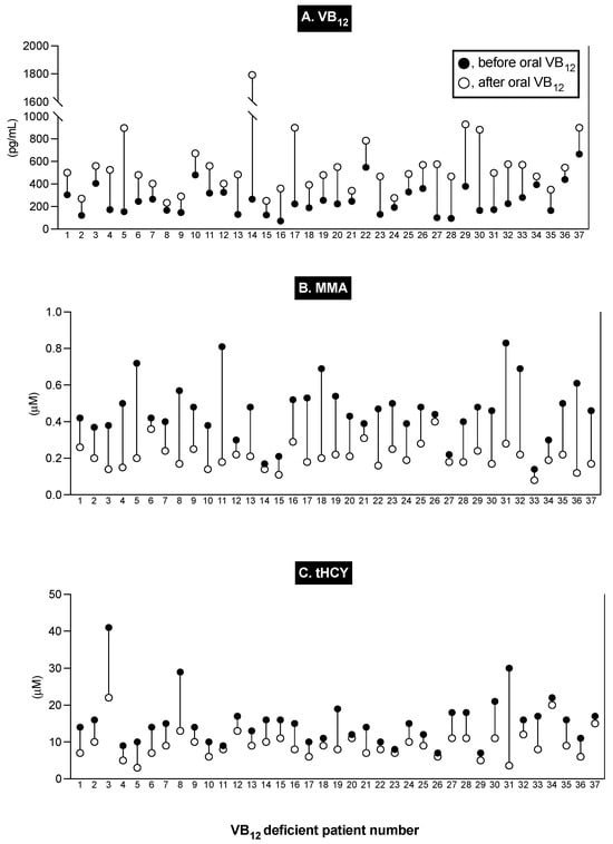 Serum VB12, serum MMA, and plasma tHCY results from 37 VB12-deficient patients after taking crystalline VB12. Patient numbers are shown on the X axis, and the change in serum VB12, MMA, and tHYC are shown on the Y axis. The solid and the open circles represent the serum values before and after taking VB12, respectively.