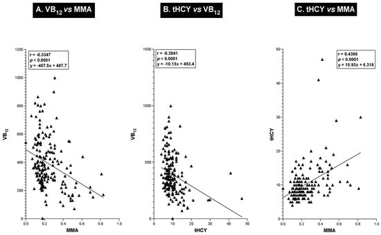 A correlation analysis of the relationship between serum VB12 levels and serum MMA/plasma tHCY levels in a given patient supports the above results that these have a reciprocal relation, with an increase in both blood MMA and tHCY levels as the VB12 levels decrease (Figure 3A,B). As seen in Figure 3A,B, there was a highly significant negative correlation (r = −0.304 and r = −0.335) (p < 0.0001) between the serum VB12 level and the serum MMA level (Figure 3A) or between the serum VB12 level and the plasma tHCY level (Figure 3B) in a given patient, and the serum MMA level directly (r = 0.437) and significantly (p < 0.0001) correlated with the plasma tHCY level in a given patient (Figure 3C).