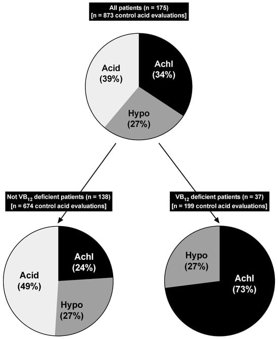Pie diagram showing mean gastric acid control value acid output category from all patient admissions [n = 873] over a 5-year period (1997–2001) stratified by presence or absence of VB12 deficiency. As outlined in the Methods section and reported previously [,], using the mean acid outputs from gastric acid control analysis from past admissions, all patients were assigned to one of three categories: the presence of sustained achlorhydria (>50% admission acid control = 0) [Achl], sustained hypochlorhydria (acid control levels from 0.1 to <1 mEq/h ->50%) [Hypo], and normal gastric acid in >50% acid controls ≥1 mEq/h [Acid]. The percentages represent the percent of patients in each VB12 group [i.e., all pts (n = 175); VB12-deficient patients (n = 37), and non-VB12-deficient patients (n = 138)], which were in each of the mean acid control categories. For all patients (n = 175), VB12-deficient (n = 37) groups, and non-VB12-deficient groups (n = 138), there were 60, 27, and 33 patients in the achlorhydric category, 47, 10, and 37 patients in the sustained hypochlorhydria category, and 68, 0, and 68 patients in the acid category, respectively. The presence of achlorhydria was significantly higher in the vitamin B12-deficient category of patients (73% vs. 24%) (p < 0.001) but not in the hypochlorhydria category (p = 0.99), and the presence of normal acid secretion was significantly higher in the non-VB12-deficient than VB12-deficient patients (49% vs. 0%) (p < 0.001).