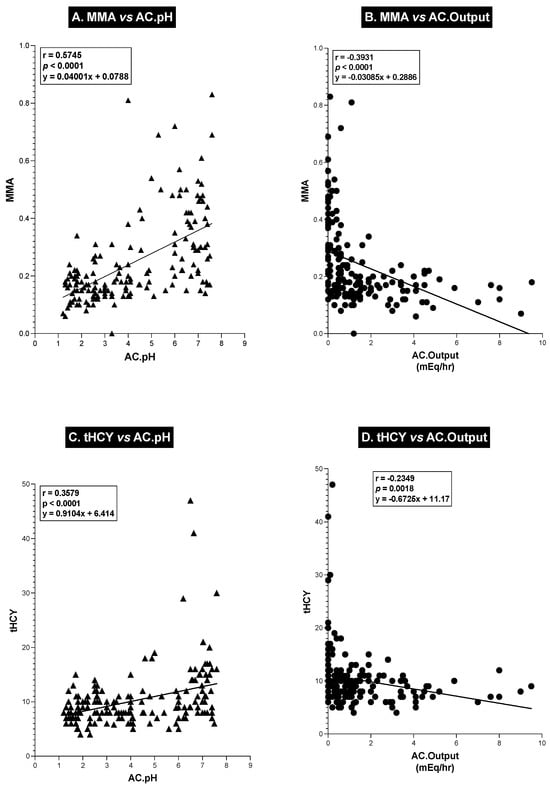 To further explore the relationship between the antisecretory drug acid control levels [acid output per hour for the hour before the next drug dose and the sample’s acid concentration (pH)] and serum VB12 levels, we performed a correlation analysis of these different variables (Figure 5) as well as the relationship between these acid control parameters and serum MMA and tHCY levels in each patient (Figure 6). As shown in Figure 5, the patients’ serum VB12 levels showed a highly significant (p = 0.0005) negative correlation (r = −0.262) with pH, with decreasing levels of acidity (increasing pH) in the control sample associated with a decrease in serum VB12 levels. Conversely, with acid output, there was a significant direct positive correlation between acid output and serum VB12 levels. These results both show that as acid output decreases or with decreasing acidity (pH) of the gastric control fluid, there is a similar proportional decrease in serum VB12 levels. A similar analysis with serum MMA (Figure 6A,B) and plasma tHCY (Figure 6C,D) also showed highly significant correlations (p < 0.0001) between changes in control acid output (mEq/h) as well as acid concentration (pH). There was a highly significant (p < 0.0001) direct correlation (r = 0.574 and r = 0.358) (Figure 6A,C) between both the serum MMA and plasma tHYC levels and the control acid concentration (pH), demonstrating that as the acidity of the sample decreased and the pH of the patients’ acid control samples increased, there was a proportional increase in serum MMA and tHCY levels, which was the opposite pattern seen with changes in serum VB12 levels (compare Figure 6,A,C and Figure 5A). Conversely, both serum MMA and plasma tHYC levels (Figure 6B,D) demonstrated a highly significant negative correlation (r = −0.393 and r = −0.235) (p < 0.0001, p = 0.0018) with changes in control hourly acid output (mEq/h), with increasing hourly acid output (decreasing acid control) associated with decreased blood concentrations of MMA and tHCY, which correlated with the higher serum VB12 levels (compare Figure 6B,D and Figure 5B).