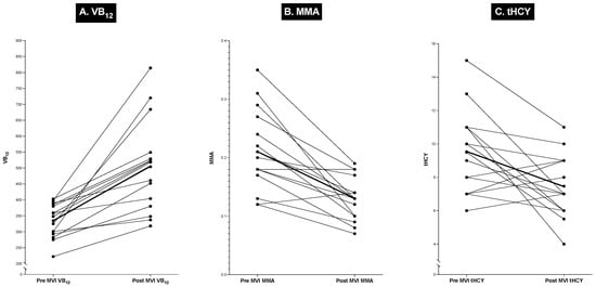 Serum VB12, serum MMA, and plasma tHCY results from 15 non-VB12-deficient patients after taking multivitamin preparations. The results from 15 patients who had started on multivitamins on their own before their final evaluation are shown. The changes in blood VB12, MMA, and tHYC between their last two NIH evaluations are shown on the Y axis, with one being prior to starting any multivitamin and the other after taking a daily multivitamin preparation, all of which contained crystalline VB12. Each line shows the effects before or after the multivitamin ingestion. The serum VB12, MMA, and tHCY levels for a given patient, shown by the dark lines, represent the mean effect. The mean changes in serum VB12 (334 ± 15 to 504 ± 40 pg/mL (p = 0.0003)), MMA (0.21 ± 0.02 uM to 0.13 ± 0.01, (p = 0.0009)), and tHCY (9.50 ± 0.69 uM to 7.43 ± 0.52 uM (p = 0.0176)) are shown.