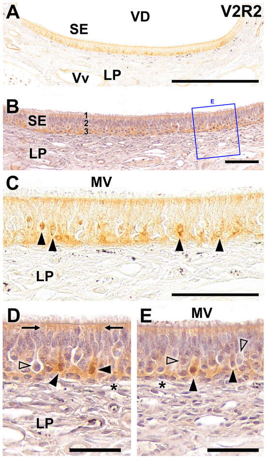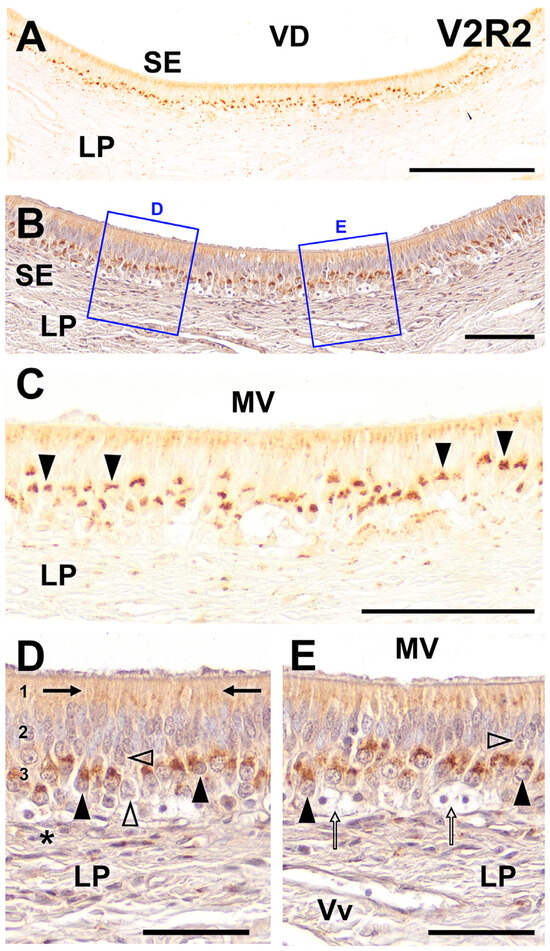 Immunohistochemical labeling of the wolf VNO using anti-V2R2 antibody. (A) Labeling is observed throughout the entire strip of the vomeronasal sensory neuroepithelium (SE), particularly in its basal part. Additionally, the apical portion of the epithelium exhibits a more diffuse labeling. (B) Counterstaining with hematoxylin of the neuroepithelium confirms this labeling pattern and allows for the identification of the structural characteristics of the cellular strata and lamina propria (LP). (C) At higher magnification, the labeling is observed to correspond to cells that, because of their spatial placement and morphological characteristics, are identified as neuroreceptor cells (arrowheads). This labeling exhibits a clean and well-defined pattern that is predominantly localized to the soma. In addition, a more diffuse pattern of labeling is evident in the apical region of the epithelium. (D,E) Higher magnification of the counterstained areas shown in 1B allows for the determination of the morphological features of the immunopositive structures. It is noticeable that in the immunopositive cells (black arrowhead), the labeling is concentrated in the apical portion of the somas. From this portion, dendrites emerge and project toward the apical surface to form the immunopositive dendritic processes (arrows). Not all receptor cells are immunopositive for V2R2, with cellular somas in different locations being immunonegative (open arrowheads). Finally, no immunopositivity is observed in the various basal cells (asterisk and open arrows). (1) Apical processes; (2) Sustentacular cells layer; (3) Neuroreceptor cells layer. MV, mucomicrovillar complex; VD, vomeronasal duct; Vv, blood vessels. Scale bars: (A): 250 μm; (B–E): 100 μm.