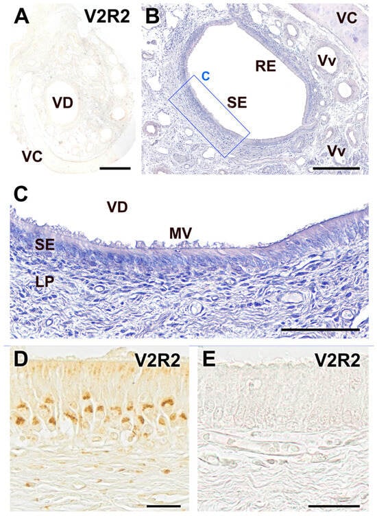Counterstaining with hematoxylin further confirmed the observed labeling pattern and facilitated the delineation of the structural characteristics of the cellular strata and the underlying lamina propria as well as the localization of V2R2 within specific cellular compartments (Figure 1B). A higher magnification of both non-counterstained (Figure 1C) and counterstained (Figure 1D,E) images provided a clearer insight into the cellular specificity of the V2R2 expression. The labeling corresponded predominantly to cells identified as VSNs based on their spatial placement and distinctive morphological features. These cells exhibited a clean and sharply defined pattern of labeling that was primarily concentrated in the soma. Additionally, we observed a diffuse labeling pattern in the apical region of the epithelium (Figure 1C). The counterstained slides showed that the labeling in the VSNs was concentrated in the apical portion of their somata (Figure 1D). Dendrites originating from these somata extended toward the apical surface, culminating in the formation of immunopositive dendritic processes (Figure 1D).