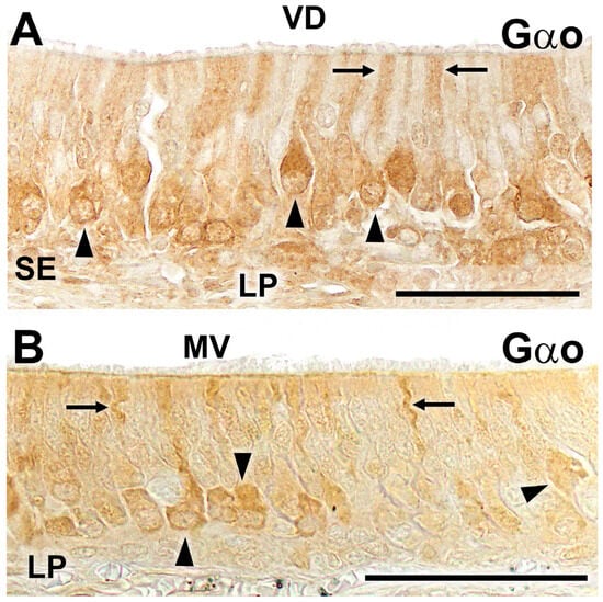 Finally, given that the expression of V2Rs is tightly linked to that of Gαo, we conducted an immunohistochemical study on VNO sections of the wolf and fox vomeronasal organ to assess whether this transduction protein was also detectable in these samples. The results are presented in Figure 4. In both species, immunopositivity for Gαo was observed in the sensory epithelium of the VNO. The immunolabeling comprised a subpopulation of non-receptor cells and extended to both the cellular somas and the dendritic processes present on the luminal surface (Figure 4A,B).