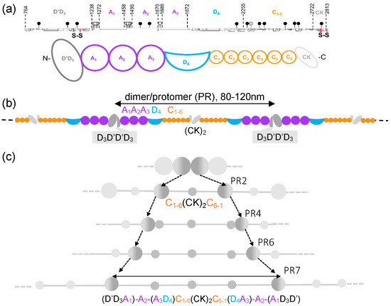 Von Willebrand factor (VWF) is a multimeric glycoprotein that circulates in the blood as a random coil with hidden functional epitopes. VWF mediates platelet adhesion and aggregation at the injured vessel wall by exposing epitopes to the platelets’ GPIb-α and integrin αIIbβ3 receptors upon extension by shear stress [1]. Exposure to stress leads to the elongation of specific domains, revealing molecular sites for self-association or proteolytic cleavage and the for further enhancement of platelet adhesion and activation [2,3]. The mature VWF monomer is a 2050-residue protein (molecular weight/MW 250 kDa) containing 12 N- and 10 O-linked oligosaccharide chains (Figure 1a). It displays an abundance of cysteines that constitute 8.3% of its amino acids, compared with the average 2.3% observed in human proteins. The monomer is structurally partitioned into distinct domains, usually represented as D’D3-A1-A2-A3-D4-C1-C2-C3-C4-C5-C6-CK, which are connected by flexible hinge regions and many of which are stabilized by disulfide bonds [4]. For ease of reference, here, we use a subscripted domain labeling D’D3A1A2A3D4C1-6CK (Figure 1a) [5]. The structurally relevant smallest unit of VWF is the protomer, which is a head-to-head dimer of two monomers connected with disulfides between their CK domains that displays two N-terminals at both ends (Figure 1b). Multimerization, up to one hundred fold physiologically, occurs by disulfide bridge formation between the N-terminal D’D3 domains of consecutive protomers [4,6,7].
