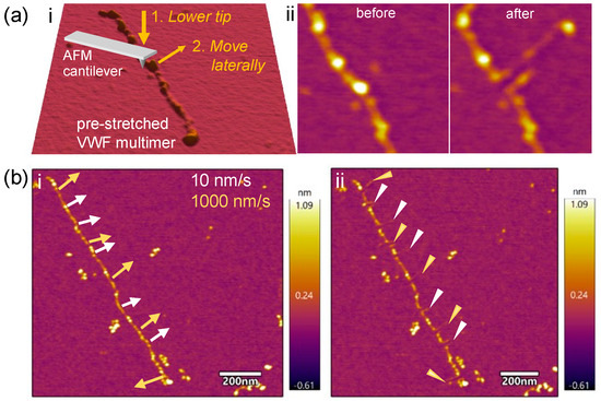 (a) VWF nanodissection with AFM. (i) Schematics of the procedure. (ii) Effect of nanodissection on VWF structure. The arrowhead points to the location where the AFM tip was initially lowered. The arrow indicates the direction and amplitude of tip motion. (b) Effect of cantilever speed on nanodissection. Height-contrast AFM images prior to (i) and following (ii) nanodissection with 10 (white arrows) and 1000 nm/s (yellow arrows), respectively. The arrows indicate the direction and the amplitude of the tip motion on (i), and the elongated structure on (ii).