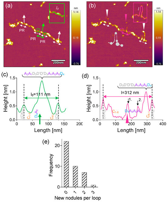 The nanodissection of VWF multimers often resulted in the emergence of protein loops that contained a variable number of nodules along the loop contour (Figure 4). In the example shown (Figure 4a), a relatively compact pre-stretched VWF multimer is seen, in which three protomers were independently nanodissected, which resulted in the emergence of one, two and three small nodules in the loops, respectively (Figure 4b). The middle protomer was analyzed in greater detail (Figure 4a,b insets, Figure 4c,d). Prior to nanodissection, a large nodule could be observed between two neighboring (CK)2 nodules, which was interpreted as a complex of D4A3 and A2A1D3D'D'D3A1A2A3D4 domains (Figure 4c). Upon nanodissecting the protomer in the region of this large nodule, a protein loop emerged that contained two small nodules that corresponded to the D4A3 domains and the A1 domain, respectively, which were interconnected with an unfolded and extended A2 domain (Figure 4d). Notably, the A1 domain is separated from the D3 of the N-junctional large nodule, which supports earlier findings about the presence of a hinge region between them [21]. Altogether, approximately half of the protein loops that emerged as a result of nanodissection contained at least one small nodule. The distribution of the number of small nodules that emerged is shown in Figure 4e.