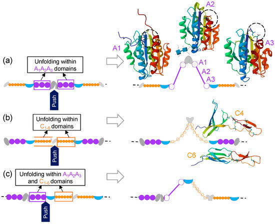 In this work, individual pre-stretched, surface-adsorbed VWF multimers were nanodissected by applying mechanical forces locally, at distinct segments and domains of the VWF protomer. Mechanical force may enhance or inhibit chemical reactions, such as protein conformational changes and intra- and intermolecular interactions, depending on the relative orientation of the force with respect to the reaction coordinate [31]. The schematic explanation of how such local forces induced the observed structural changes in VWF is shown in Figure 5. Altogether, regardless of where exactly the point of attack of the mechanical force is, the additional, cryptic extensibility is found in either the A1–3 or the C1–6 domain regions. Unfolding in these regions results in thinned loop strands, whereas any domain that remains folded appears in the AFM images as small nodules along the loop contour. Although the forces employed during nanodissection are perpendicular to the VWF multimer axis—hence, they are in stark contrast to the forces that VWF is exposed to under in vivo conditions [2,32]—the nanodissection experiments revealed that VWF multimers contain an extensive reservoir of extensibility, which can be liberated under extreme conditions.