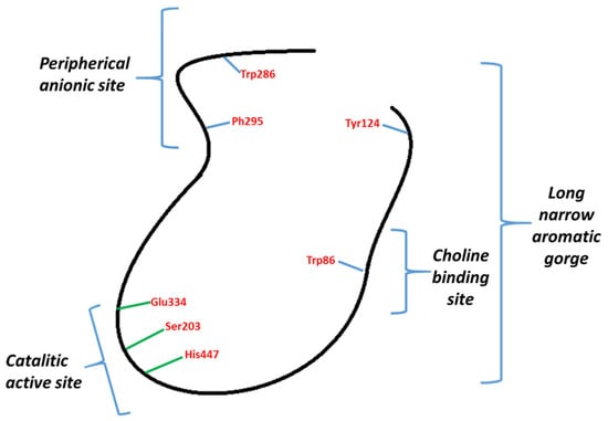 Inhibitors of AChE may be classified into two types: those binding to CAS and those binding PAS (Figure 1). Galantamine binds to CAS and donepezil to CAS and PAS. These have attracted attention, given that it has been described how AChE through PAS interacts with Aβ peptides, stimulating their aggregation [24,25]. The reduction of its formation, build-up, and aggregation are some of the main goals in the development of a cure for AD.