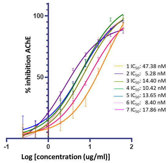 The most common neurodegenerative diseases (NDs) include Alzheimer’s disease (ND), Parkinson’s disease, prion disease, amyotrophic lateral sclerosis, motor neuron disease, Huntington’s disease, spinal muscular atrophy, and spinocerebellar ataxia [1,2]. AD is a neurodegenerative disease that is responsible for approximately 70% of cases of dementia and is characterized by loss of memory and other cognitive disabilities [3,4,5,6]. Despite the different and varied investigations, the exact molecular mechanism involved in AD initiation and progression is still unclear. Thus far, the available data clearly suggest that AD is a complex, multifactorial disorder Please note that the size of figures will be adjusted appropriately to ensure the clarity and readability of the image. Changes to the position of figures and tables may occur during the production stage, and advanced age is the most significant risk factor. The neurodegenerative process could be due to three causes: the accumulation of amyloid beta peptide deposit (AB); alteration and accumulation of hyperphosphorylated protein tau; and oxidative stress in the brain. These factors lead to synaptic dysfunction and neurodegeneration [7,8,9]. In Alzheimer’s disease, the sum of several biochemical and cellular events that are not yet fully understood invariably leads to the loss of cholinergic neurons in the basal forebrain nuclei [10]. These processes produce a progressive reduction of the neurotransmitter acetylcholine (ACh), which produces loss of memory and cognitive deficit [11,12].