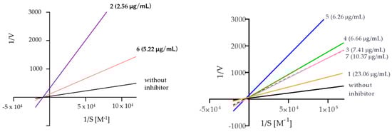 The analysis of the Lineweaver–Burk plots (Figure 4) for the compounds assayed showed that compounds 3, 4, 5, and 7 are mixed inhibitors, while compounds 2 and 6 are noncompetitive inhibitors. The above was inferred from the calculation of alpha, whose value is greater than one, meaning that these compounds (3–5 and 7) can act with greater affinity on the free enzyme compared to the enzyme–substrate complex. Moreover, compound 7 has a very large alpha value, suggesting an exclusive preference for the free enzyme; therefore, its binding mode is much closer to that of a competitive inhibitor compared to the 3–5 inhibitors.