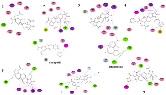 Two-dimensional binding interactions of compound 1–7 with the best docking energy values. Hydrogen bonds are highlighted in green and hydrophobic interactions in pink.