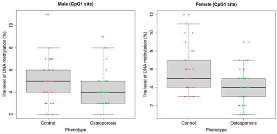The differential DNA methylation of the promoters and regulatory regions of the RUNX2 gene is poorly understood in the context of associative search with osteoporosis itself, as well as with individual endophenotypes: fractures and low BMD levels. The whole-epigenome studies (EWAS) of osteoporosis have not identified the significant signatures of the differential CpG site methylation of the RUNX2 gene [], while according to various data, the methylation status of the gene may influence the risk of ankylosing spondylitis [], and the methylation status of the adjacent region to the RUNX2 gene may be associated with the risk of developing osteoarthritis []. According to Haga et al. (2015), the methylation status of the promoter region of RUNX2 did not change during osteoblastic differentiation; however, the analysis was only conducted on the MSC cultured line without reference to the osteoporotic phenotype []. Thus, the role of the differential and aberrant methylation of the RUNX2 gene in individuals with osteoporosis remains an unresolved scientific problem that requires further research and the search for DNA methylation status signatures in this gene that may be directly associated with the osteoporotic phenotype, i.e., the risk of fractures and low BMD levels.