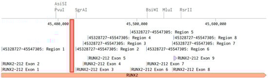 Structure of the RUNX2 gene; the investigated DNA section is highlighted in red. The screenshot taken from the benchling.com web platform. GRCh38 human genome assembly.
