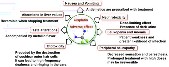 - Astolfi, L.; Ghiselli, S.; Guaran, V.; Chicca, M.; Simoni, E.; Olivetto, E.; Lelli, G.; Martini, A. Correlation of adverse effects of cisplatin administration in patients affected by solid tumours: A retrospective evaluation. Oncol. Rep. 2013, 29, 1285–1292. [Google Scholar] [CrossRef]