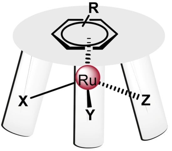 - Swaminathan, S.; Haribabu, J.; Balakrishnan, N.; Vasanthakumar, P.; Karvembu, R. Piano stool Ru(II)-arene complexes having three monodentate legs: A comprehensive review on their development as anticancer therapeutics over the past decade. Coord. Chem. Rev. 2022, 459, 214403. [Google Scholar] [CrossRef]