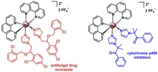 - Zamora, A.; Denning, C.A.; Heidary, D.K.; Wachter, E.; Nease, L.A.; Ruiz, J.; Glazer, E.C. Ruthenium-containing P450 inhibitors for dual enzyme inhibition and DNA damage. Dalton Trans. 2017, 46, 2165–2173. [Google Scholar] [CrossRef] [PubMed]