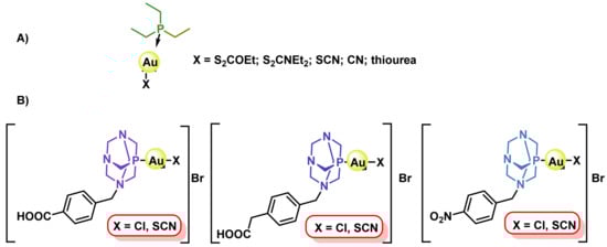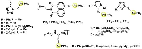 - Vergara, E.; Cerrada, E.; Clavel, C.; Casini, A.; Laguna, M. Thiolato gold(i) complexes containing water-soluble phosphane ligands: A characterization of their chemical and biological properties. Dalton Trans. 2011, 40, 10927–10935. [Google Scholar] [CrossRef] [PubMed]