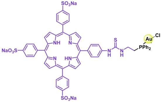 - Tasan, S.; Licona, C.; Doulain, P.E.; Michelin, C.; Gros, C.P.; Le Gendre, P.; Harvey, P.D.; Paul, C.; Gaiddon, C.; Bodio, E. Gold-phosphine-porphyrin as potential metal-based theranostics. J. Biol. Inorg. Chem. 2015, 20, 143–154. [Google Scholar] [CrossRef] [PubMed]