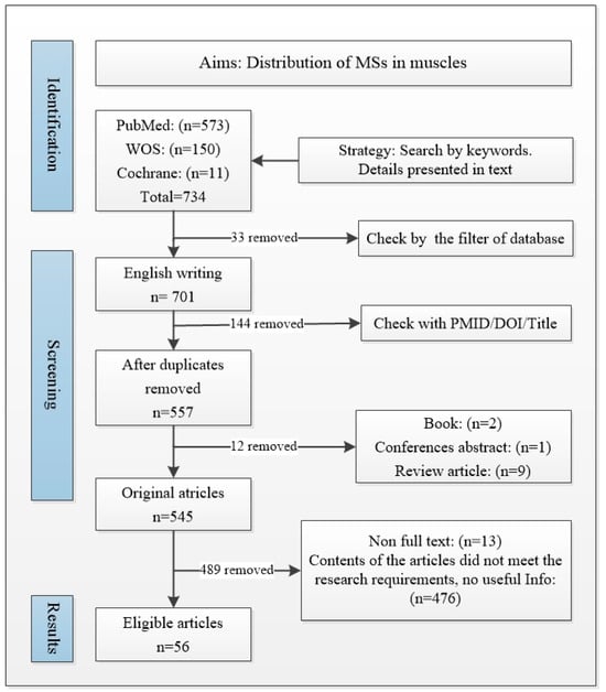 The databases used included Web of Science (WOS), PubMed, and Cochrane, with the keywords of muscle spindle*, distribut*(distribution; distribute), and locat*(location; locate), following the string PubMed: (muscle spindle*[Title/Abstract]) AND (distribut*[Title/Abstract] OR locat*[Title/Abstract]); WOS: (muscle spindle*[title]) and (distribut* or locat* [topic]); Cochrane: (distribution or location or distribut* or locat*[Title Abstract Keyword]) and (muscle spindle*[Title Abstract Keyword]).