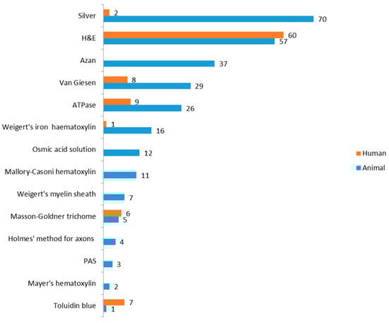 Staining methods used in MS studies. Silver and H&E were the main techniques. The bars in blue present the animal studies and orange bars stand for human studies. PAS: Periodic Acid-Schiff stain.