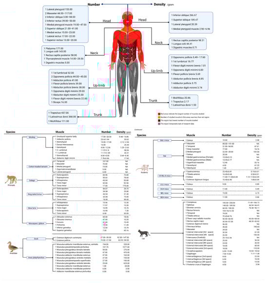 In humans, a total of 77 muscles (36 kinds) were investigated. Data on muscle mass were obtained from 59 of those 77 muscles, and the MS quantity was completely extracted. We present the muscle data according to different parts of the human body. In humans, muscles from the head, upper limbs, and neck were mainly studied, with an underrepresentation of other areas (Figure 5).