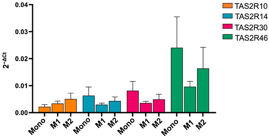 Gene expression of TAS2R in monocytes (Mono) and M1 and M2 macrophages. Data are mean ± SEM of 3 independent experiments and expressed as 2−ΔCt.
