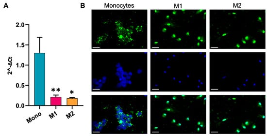 Expression of TAS2R46 in human monocytes and monocyte-derived macrophages. (A) qPCR analysis of TAS2R46 in monocytes and M1 and M2 macrophages. Data are mean ± SEM of four independent experiments. ** p < 0.01; * p < 0.05 vs. Mono (monocytes). (B) Representative images of immunofluorescence analysis of hTAS2R46 expression on monocytes (Mono) and M1 and M2 macrophages. Green: hTAS2R46; blue: DAPI (nuclei). Scale bar: 25 µm.