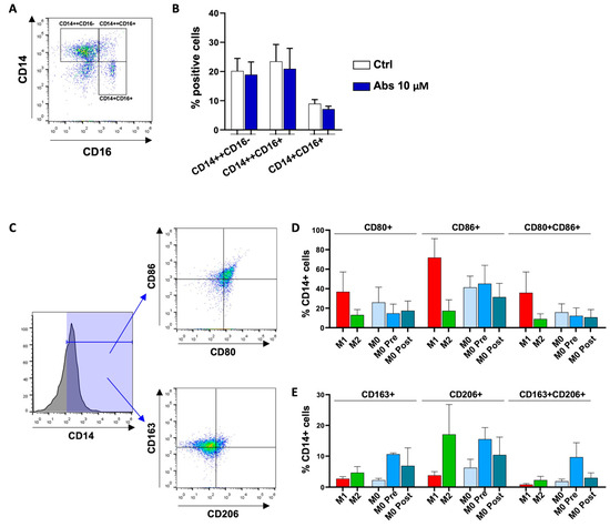 Immunomodulatory effect of absinthin on monocytes and macrophages. (A) Gating strategy for monocyte phenotype analysis (dot plot). (B) Monocytes were treated with 10 μM absinthin for 1 h and then stained with APC anti-CD14 and FITC anti-CD16 antibodies. (C) Gating strategy for macrophage phenotype analysis. CD14+ cells were selected (histogram), and then, we evaluated the positivity to other CD markers (dot plots). (D,E) M0 were obtained from monocytes stimulated with absinthin (10 μM) and then left to differentiate in enriched medium with 20% FBS (M0 pre) or obtained from monocytes left to differentiate in enriched medium with 20% FBS. Then, fully differentiated M0 were stimulated with 10 μM absinthin (M0 post). Cells were stained with the following antibodies: FITC anti-CD80 and PE anti-CD86 for the M1 phenotype (D) and PerCP anti-CD206 and FITC anti-CD163 for the M2 phenotype (E). Results are expressed as the percentage of positive cells for each marker of the total of the CD14+ cells. M1 and M2 represent the positive control for macrophage marker expression.