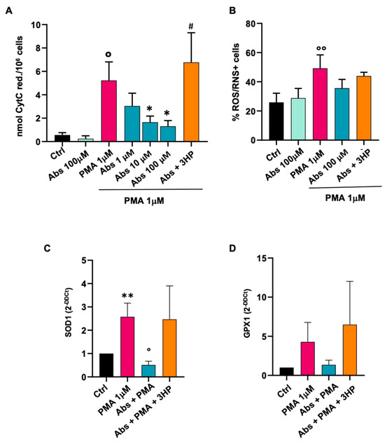 Effect of absinthin on oxidative stress in human monocytes. Cells were pre-incubated with absinthin (Abs) at the indicated concentration with/without the hTAS2R46 antagonist 3HP (10 μM) and then stimulated with PMA (1 μM) for 30 min. (A) Dose-dependent decrease in the PMA-oxidative burst in monocytes pre-incubated with absinthin for 1 h and then stimulated with indicated drugs. Data are expressed as nmol of reduced cytochrome C/106 cells and are the mean ± SEM of 6 independent experiments, analysed using one-way ANOVA with a Kruskal–Wallis test for multiple comparisons. Significance levels: ° p < 0.05 and °° p < 0.01 vs. Ctrl; * p < 0.05 vs. PMA; # p < 0.05 vs. Abs 10 μM. (B) Cytofluorimetric analysis of ROS/RNS-positive cells pre-incubated with absinthin for 1 h, in the presence or absence of the indicated drugs. Data are mean ± SEM of 4 independent experiments. (C) qPCR analysis of SOD1 expression after monocyte pre-incubation with absinthin for 6 h and then stimulation with indicated drugs. Data are expressed as mean ± SEM of 4 independent experiments. (D) qPCR analysis of GPX1 expression after monocytes were pre-incubated with absinthin for 6 h and then stimulated with indicated drugs. Data are expressed as mean ± SEM of 4 independent experiments Significance levels: ** p < 0.01 vs. Ctrl; ° p < 0.05 vs. PMA. Abs, absinthin; Ctrl, control (unstimulated cells); PMA, phorbol 12-mystrate 13-acetate; 3HP, 3-hydroxypelenolide.