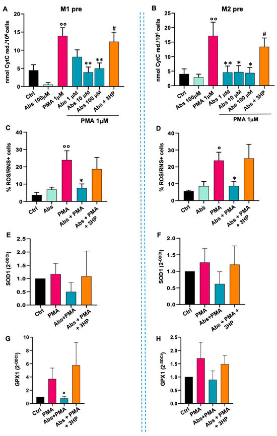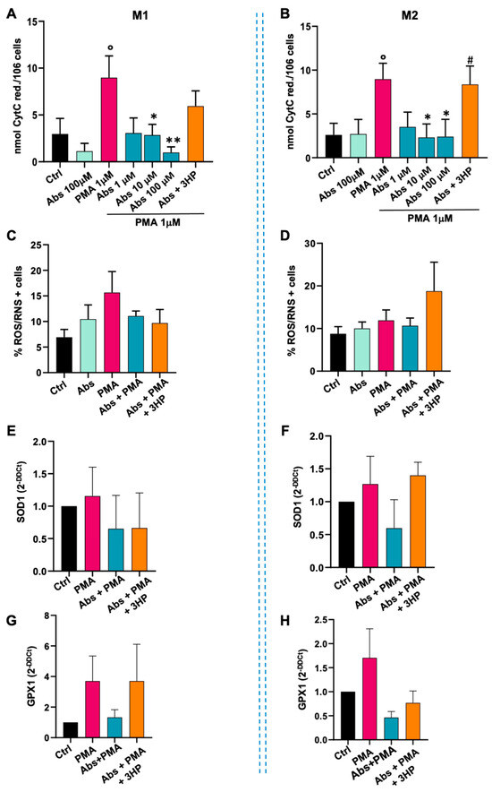 Effects of absinthin on oxidative stress in M1 and M2 pre-macrophages. Monocytes were incubated with absinthin at the indicated concentrations with/without hTAS2R46 antagonist 3HP (10 μM) before driving macrophage differentiation. Fully differentiated macrophages were then stimulated with PMA (1 μM) for 30 min. (A) PMA-induced oxidative burst in macrophages M1 and (B) in macrophages M2. Data are expressed as nmol of reduced cytochrome C/106 cells and indicated as means ± SEM of 6 independent experiments. (C) Cytofluorimetric analysis of ROS/RNS-positive macrophages M1 and (D) positive macrophages M2, in the presence or absence of the indicated drugs. Data are expressed as mean ± SEM of 4 independent experiments. (E) qPCR analysis of SOD1 expression in macrophages M1 and (F) in macrophages M2. (G) qPCR analysis of GPX1 expression in macrophages M1 and (H) in macrophages M2. Data are expressed as mean ± SEM of 4 independent experiments. Results were analysed using one-way ANOVA with a Kruskal–Wallis test for multiple comparisons. Significance levels: ° p < 0.05 and °° p < 0.01 vs. Ctrl; * p < 0.05 and ** p < 0.01 vs. PMA; # p < 0.05 vs. Abs 10 μM. Abs, absinthin; Ctrl, control (unstimulated cells); PMA, phorbol 12-mystrate 13-acetate; 3HP, 3-hydroxypelenolide.