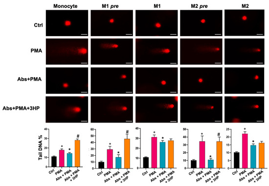 Absinthin protects monocytes and macrophages from PMA-induced DNA damage. Monocytes, fully differentiated macrophages, and macrophages derived from treated monocytes (M1 and M2 pre) were pre-incubated for 1 h with Abs (10 μM) with/without 3HP (10 μM) and then stimulated with PMA (1 μM) for 30 min. Tail DNA percentage was used as a parameter to indicate DNA damage. Data are expressed as the mean ± SEM of at least 50 single cells analysed in three independent experiments. Results were analysed using one-way ANOVA with a Kruskal–Wallis test for multiple comparisons. Significance levels: ° p < 0.05 vs. Ctrl; * p < 0.05 vs. PMA; # p < 0.05 vs. Abs (10 μM). Magnification: 100×. Abs, absinthin; Ctrl, control (unstimulated cells); PMA, phorbol 12-mystrate 13-acetate; 3HP, 3-hydroxypelenolide. Scale bar: 25 μm.