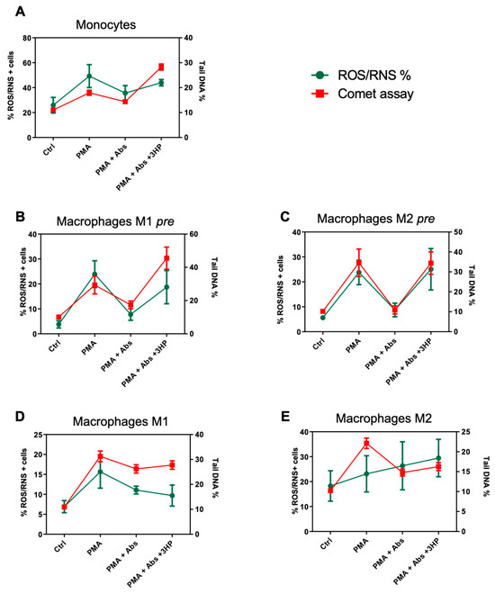 The correlation between the levels of ROS/RNS and oxidative damage to the DNA in (A) monocytes, (B) M1 macrophages, and (C) M2 pre (derived from monocytes treated with absinthin and then differentiated toward macrophages), and (D) M1 macrophages and (E) M2 treated with absinthin and PMA at the end of differentiation. Red line represents the DNA damage as a percentage of the DNA tail; green line represents the percentage of ROS/RNS probe-positive cells. Ctrl, control (untreated cells); Abs, absinthin; 3HP, 3-hydroxypelenolide.