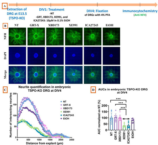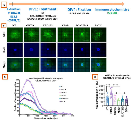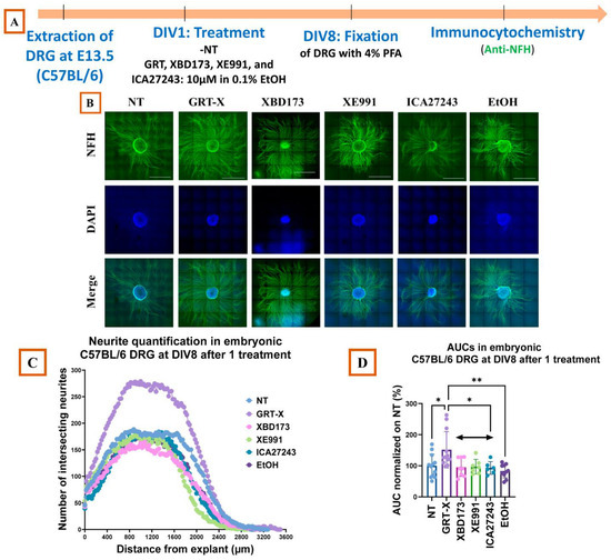 DRGs were extracted from C57BL6/J embryos as previously described. A total of 40 DRGs were harvested per embryo for each group (Figure 8B). Based on the experimental protocol developed by Sundaram et al. [39], DRGs were incubated in trypsin (0.25% trypsin in 1X HBSS) at 37 °C for 30 min. Trypsinization was stopped by adding L-15 medium containing 10% horse serum (Gibco, 26050088). The individual DRG solutions were centrifuged at 1500 rpm for 5 min. The supernatant was removed, and the tissues were resuspended in DRG Plating Media and triturated 30 times with a sterilized Pasteur pipette until a homogeneous cell suspension was obtained. For each treatment (NT, GRT-X, XBD173, XE991, ICA27243, EtOH), 40 dissociated DRGs were plated on 35 mm culture dishes each, which were previously coated with PLL (Sigma P7890) and collagen (R&D systems 3440-100-01). The cells were then cultured in DRG Plating Media for 16 h to allow the cells to attach. The next day, the culture media were replaced by Neurobasal Media containing different treatments (NT, GRT-X 10 µM, XBD173 10 µM, XE991 10 µM, ICA2743 10 µM, EtOH 0.1%), and the cells were kept in culture for a period of 4 days. The experiments were repeated 3 times.