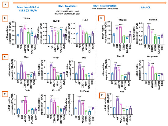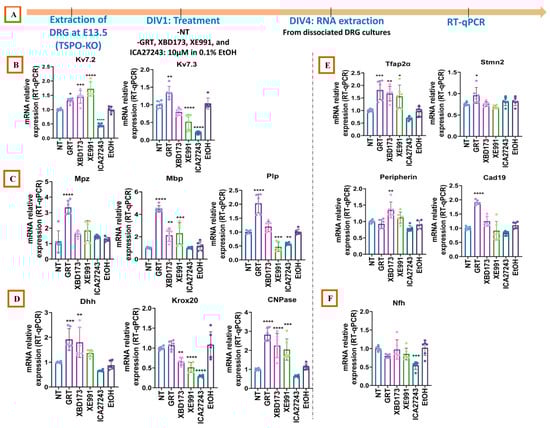 mRNA expression of GRT-X target genes (B) and genes involved in myelination (C), Schwann cell differentiation (D), and neuronal structure (E,F) in TSPO-KO DRG. (A): protocol used; (B–F): relative quantification of mRNA levels of Kv7.2, Kv7.3, Mpz, Mbp, Plp, Dhh, Krox20, CNPase, Tfap2α, Peripherin, Cad19, and Nfh from dissociated cultures of TSPO-KO embryonic DRGs at DIV4 following the different treatments. Data represent the mean ± SD of 3 independently performed experiments. * p < 0.05, ** p < 0.01, *** p < 0.001, **** p < 0.0001 (ANOVA followed by Tukey’s Multiple Comparison Test). Only comparisons with the non-treated group are represented in this figure. For further information, please refer to Supplementary Table S2.