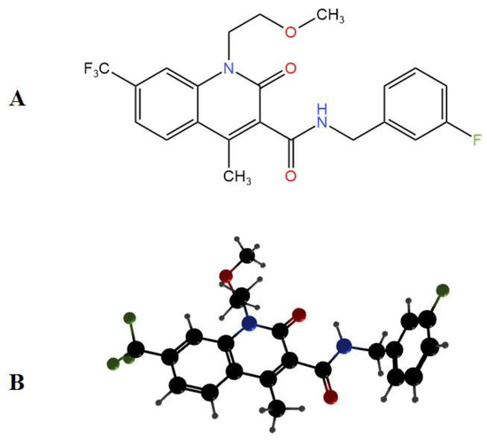 (A): Chemical structure of GRT-X (N-[(3-fluorophenyl)-methyl]-1-(2- methoxyethyl)-4-methyl-2-oxo-(7-trifluoromethyl)-1H-quinoline-3-caboxylic acid amide); (B): 2D representation of GRT-X. Black represents carbon atoms, blue represents nitrogen atoms, and red represents oxygen atoms.