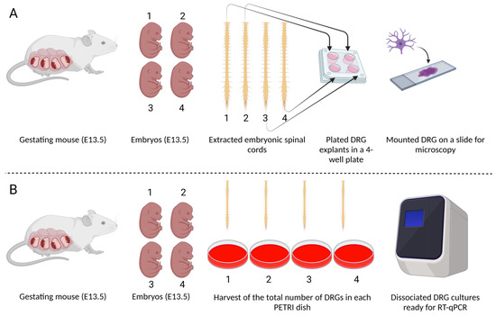 Experimental design (A) for DRG explant cultures: Embryos were surgically removed from pregnant females at E13.5 and spinal cords subsequently extracted. Each treatment (NT, GRT-X, XBD173, XE991, ICA27243, and EtOH) was allocated to a separate 4-well plate, with each well containing a DRG explant from a distinct embryo. Confocal microscopy was conducted at the designated time points after mounting the DRG explants on slides. (B) Dissociated DRG cultures: Spinal cords were obtained following the same procedure as in (A). A total of 40 DRGs per spinal cord were harvested, dissociated, and cultured in individual PETRI dishes, each representing a distinct treatment group (NT, GRT-X, XBD173, XE991, ICA27243, and EtOH). Real-time quantitative polymerase chain reaction (RT-qPCR) analysis was performed at the specified time points.