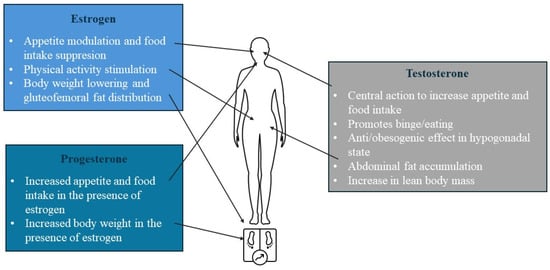 In addition to their importance in regulating fat distribution, sex hormones are also involved in appetite regulation, as oestrogen decreases appetite and food intake in women, while progestine, progesterone in the presence of oestrogen, and testosterone increase appetite and food intake [66]. This is evident from the varying caloric intake across the menstrual cycle. Increasing oestrogen levels cause a progressive decrease in eating during the follicular [67] and the 4-day periovulatory phase, when estradiol is at its highest levels, which is not seen in anovulatory women [68,69]. Additionally, resting energy expenditure fluctuates during the menstrual cycle, reaching its lowest point during the early follicular phase and increases to approximately 50–100 kcal/day more in the luteal phase [67]. The effect of sex steroid hormones on appetite is summarised in Figure 2.