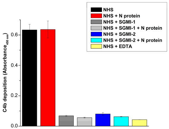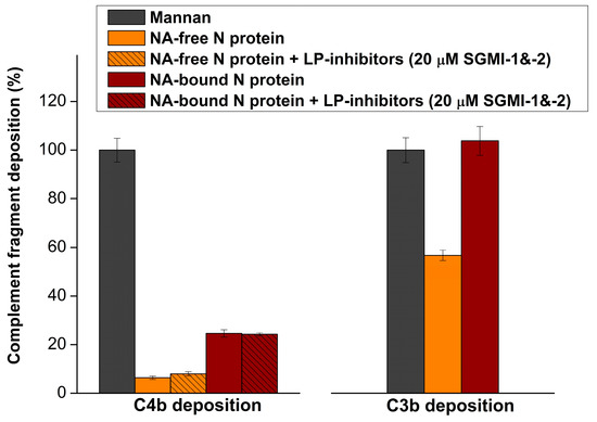 C4b and C3b deposition assays were detailed in a previous paper [33]. Briefly, LP activation was initiated on 10 µg/mL mannan-coated high-binding microtiter plates (Greiner Bio-One, (Mosonmagyarovar, Hungary) #655061), and 2% normal human serum was applied in 10 mM HEPES pH 7.5, 150 mM NaCl, 5 mM CaCl2, 5 mM MgCl2, 0.05% Tween-20 serum dilution buffer in the presence or absence of 2 µM N protein. The deposited C4b was detected with 1/2000-time diluted anti-human C4c antibody (DAKO, (Santa Clara, CA, USA) #Q0369).