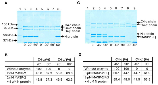 The proteolytic activity of active and zymogen MASP-2 can be measured on its natural substrate C4. Two nM MASP-2 was incubated with 1 µM purified C4 and 4 µM N protein or the same volume of its storage buffer. The reaction buffer contained 10 mM HEPES pH 7.5, 150 mM NaCl, 5 mM CaCl2, and 3% glycerol. The enzymatic reactions were incubated at 37 °C; samples were taken at 0 min, 20 min, and 60 min and were run on SDS-PAGE under reducing conditions. C4 was incubated with the same amount of N protein for 60 min to visualize possible self-degradation. In the case of zymogen MASP-2, 3 µM of Arg444Gln mutant was applied using the same experimental setup; samples were taken at 0 min, 45 min, and 90 min. Appearance of the cleaved α’ chain and the disappearance of the α chain were analyzed with densitometry and expressed as percentage of the non-cleaved C4.