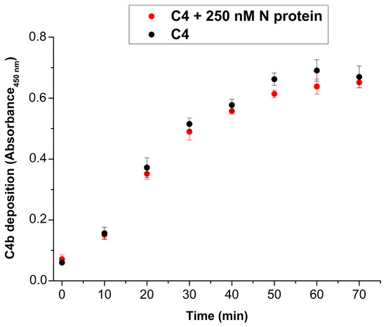 In the previous experiments, we mixed the isolated proteins in the fluid phase and showed that the N protein cannot stimulate the enzymatic activity of MASP-2. However, LP activation usually takes place on an activation surface and MASP-2 is in a complex with PRMs, such as MBL. This scenario is much closer to the physiological situation than the fluid phase reaction between the MASP-2 catalytic fragment and the N protein. To test whether the N protein has any effect on the proteolytic activity of the surface-deposited MBL–MASP-2 complexes, we used the assay system developed by Petersen et al. [17]. In this assay system, the MBL–MASP-2 complexes are deposited on a mannan-coated surface and the components of the CP are washed away using a high salt concentration (1 M NaCl). After washing, we added C4 to the surface-deposited MBL–MASP-2 complexes with or without N protein. After incubation at 37 °C for 0–70 min, we detected the C4b deposition at different time points (Figure 4). The presence of the N protein did not make any difference in the C4b deposition. We can conclude that even when MASP-2 is in complex with MBL, the N protein cannot stimulate its proteolytic activity.