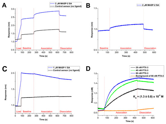 A previous study using SPR reported direct interaction between the catalytic fragment of MASP-2 (CCP1-CCP2-SP) and the N protein [13]. We used a similar technique, BLI (bio-layer interferometry). We immobilized the recombinant N protein via N-terminal His-tag to the BLI sensor and incubated it in different protein solutions. To validate the system, we used long pentraxin 3 (PTX3), which was previously shown to bind to N protein with high affinity [11]. In our experimental system, the PTX3 bound to the immobilized N protein with a KD of (1.3 ± 0.8) × 10−8 M (Figure 6). When we used the wild-type MASP-2 catalytic fragment, we obtained a negative signal. The reason for this unexpected phenomenon could be that the MASP-2 protease digests the immobilized N protein on the sensor (Figure S2). The same phenomenon was detected in the case of the Arg444Gln zymogen mutant, which also has some proteolytic activity on the N protein. In order to eliminate the effect of the proteolysis, we used the Ser633Ala mutant MASP-2. In this mutant the catalytic Ser633 in the active site is mutated to alanine. The Arg444Ile445 bond in the activation peptide was cleaved with MASP-1 [16]. In this way, we obtained a proteolytically inactive two-chain form of MASP-2. In the BLI experiment, however, this inactive form of MASP-2 was not able to bind to the N protein. We can conclude that the CCP1-CCP2-SP catalytic fragment of MASP-2 does not bind to the N protein. The negative results obtained with BLI are consistent with the above enzymatic and functional measurements and confirm that there is no interaction between the two proteins. Finally, we tested the binding of MASP-1 to the N protein. To avoid the proteolysis of the N protein, in this experiment we used the inactive catalytic fragment (CCP1-CCP2-SP, Ser646Ala) of MASP-1. Similar to MASP-2, we did not detect any binding to the N protein.