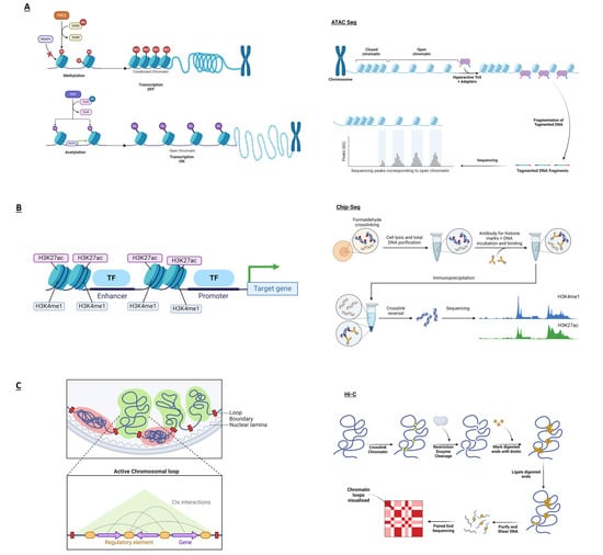 Overview of techniques in functional genomics. (A) Left panel: Tightly packed chromatin, marked by histone methylation and mediated by methyl group transfers and a group of proteins which modify chromatin, prevents the transcriptional machinery from accessing the DNA molecule, making the latter transcriptionally inactive. On the other hand, upon an enzyme-mediated histone acetylation, chromatin loosens and facilitates RNA polymerase II (RNAPII) to start transcription. Loosened chromatin regions can be studied using the ATAC-seq technique. Right panel: The Tn5 transposase catalyses the integration of adapters into accessible DNA segments—fragmenting DNA. This product can then be sequenced to pinpoint peaks of open, active, chromatin regions. (B) Left panel: The study of chromatin state is crucial in regulating gene expression. Right panel: The ChIP-seq technique determines epigenome marks (such as enhancers) and several epigenetic signatures. DNA and proteins form cross-links in formaldehyde-fixed cells. Upon cell disruption, extracted DNA is then tagged with histone marker-specific antibodies to determine cross-linked DNA–protein interactions. Cross-linked DNA is then released and then sequenced. (C) Left panel: The nature of chromatin packing influences gene regulation, with active loops (in green) being transcriptionally active and inactive loops (in red) suppressing it. Right panel: The preserved chromatin structure is processed with restriction enzymes with biotin-tagged ends. Subsequently, ligated ends are then purified and sequenced to identify interactions across distant genomic regions. Images generated with BioRender.com.